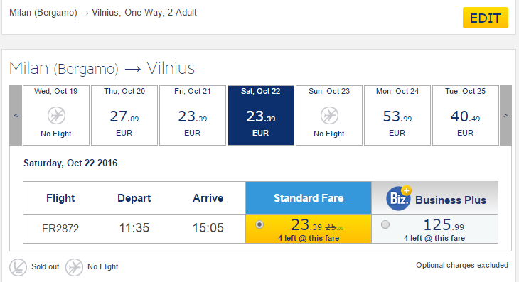 Milano airport shuttle: 4 €; Skrydis Milanas - Vilnius: 23,39 €;